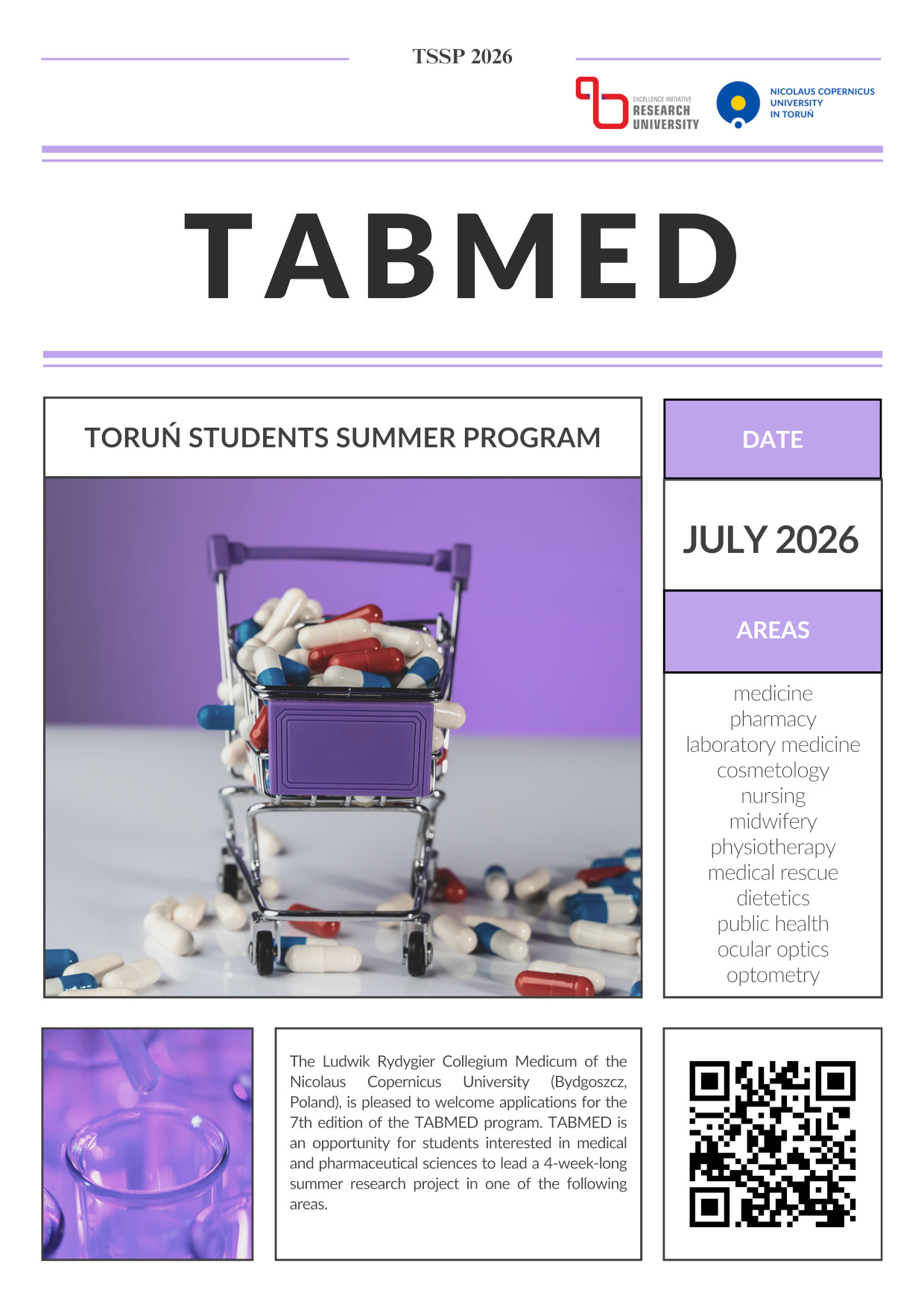 The Ludwik Rydygier Collegium Medicum of the Nicolaus Copernicus University (Bydgoszcz, Poland), is pleased to welcome applications for the 7th edition of the TABMED program. TABMED is an opportunity for students interested in medical and pharmaceutical sciences to lead a 4-week-long summer research project in one of the following areas: